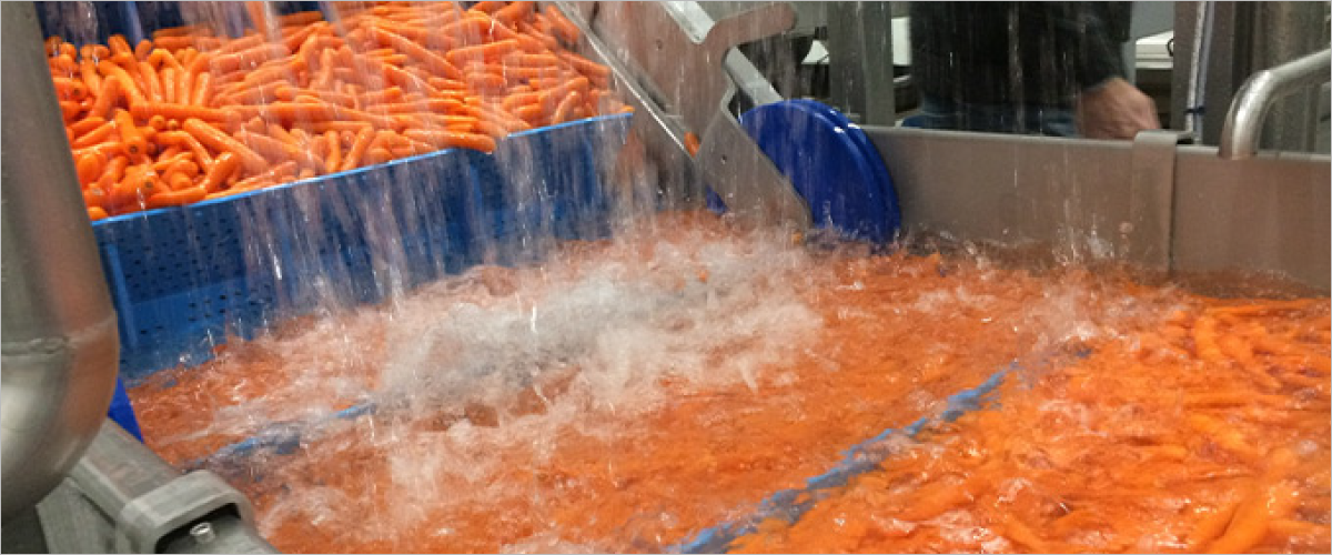 野菜加工工場の洗浄工程は、搬入ベルトで土壌を洗い流すことから始まり、皮むき前後の洗浄/すすぎへと続きます。これらの洗浄とすすぎが行われる水槽は、積荷ごとに水を交換することができません。そのため、バッチ処理では、前の工程で使用された水がいくらか混入することになります。最終段階に至るまで、野菜の洗浄にはそれほど注意が払われません。